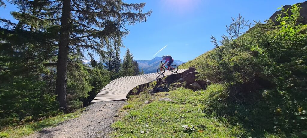 Le Plan de Corones (Kronplatz) se distingue par un bikepark très structuré, avec des pistes classées par niveau. Les pistes « green » et « blue » offrent des courbes larges, des modules doux et des sections flow adaptées aux novices. L’avantage de Kronplatz est la présence d’infrastructures complètes : parkings vastes, services de location, ateliers mechanics et écoles de VTT. Les débutants peuvent s’entraîner sur de courtes liaisons pour travailler la position, la gestion des virages et le freinage progressif avant d’attaquer des sections plus longues.