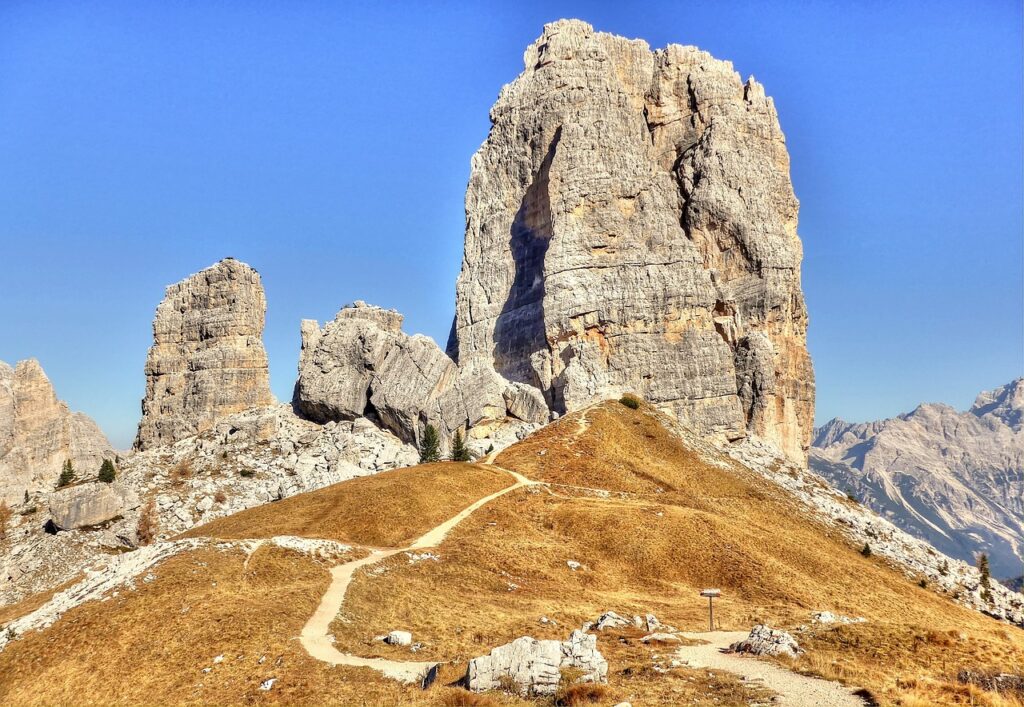Pour ceux qui recherchent des crêtes plus courtes mais extrêmement photogéniques, les Cinque Torri et les arêtes de la Tofana (surtout Tofana di Rozes et Tofana di Mezzo) sont des destinations parfaites. Elles combinent formation rocheuse typique, voies historiques et panoramas sur Cortina d’Ampezzo et ses environs.